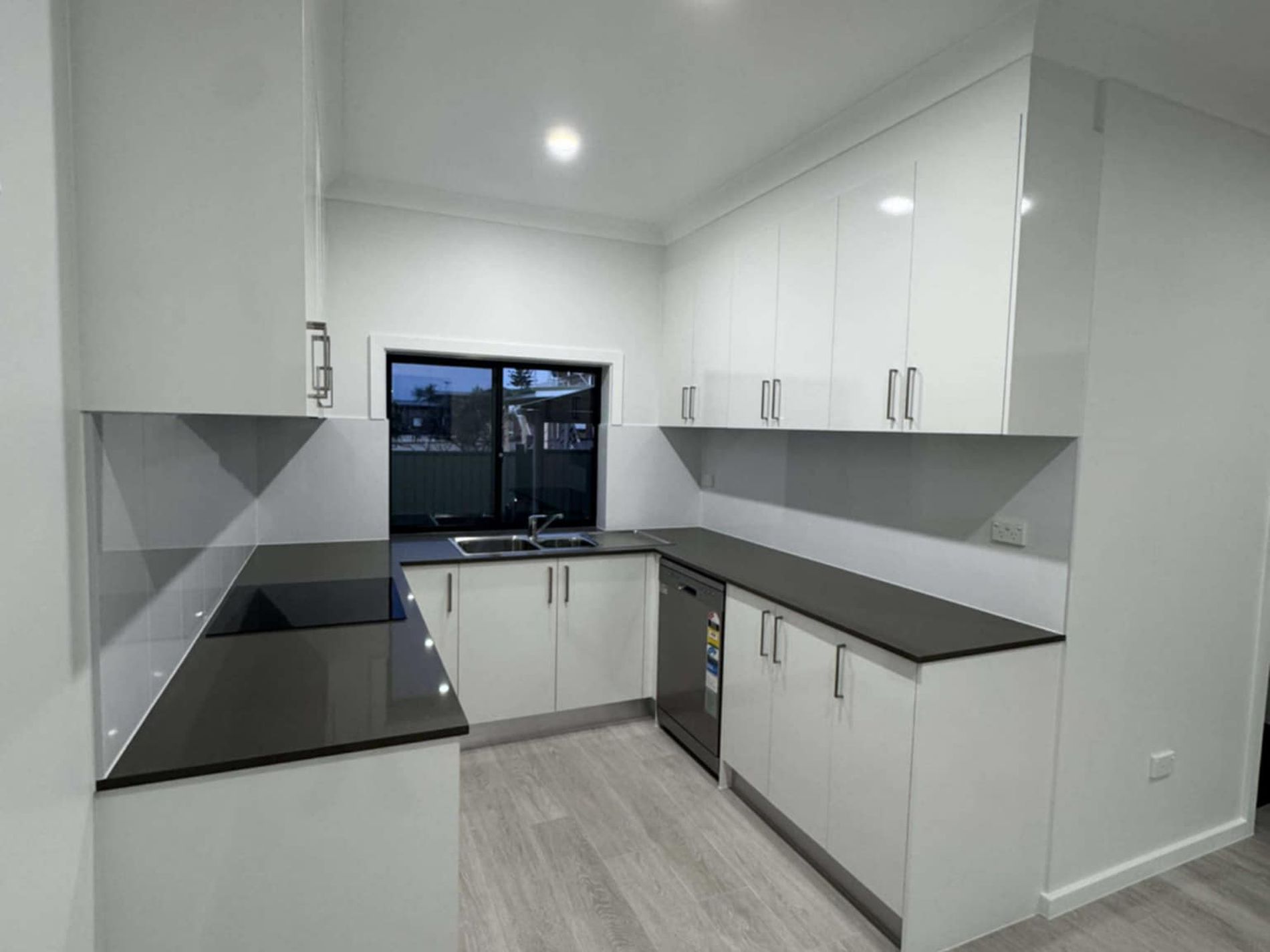 • Modern kitchen with electric cooktop, oven, ample cupboard space.