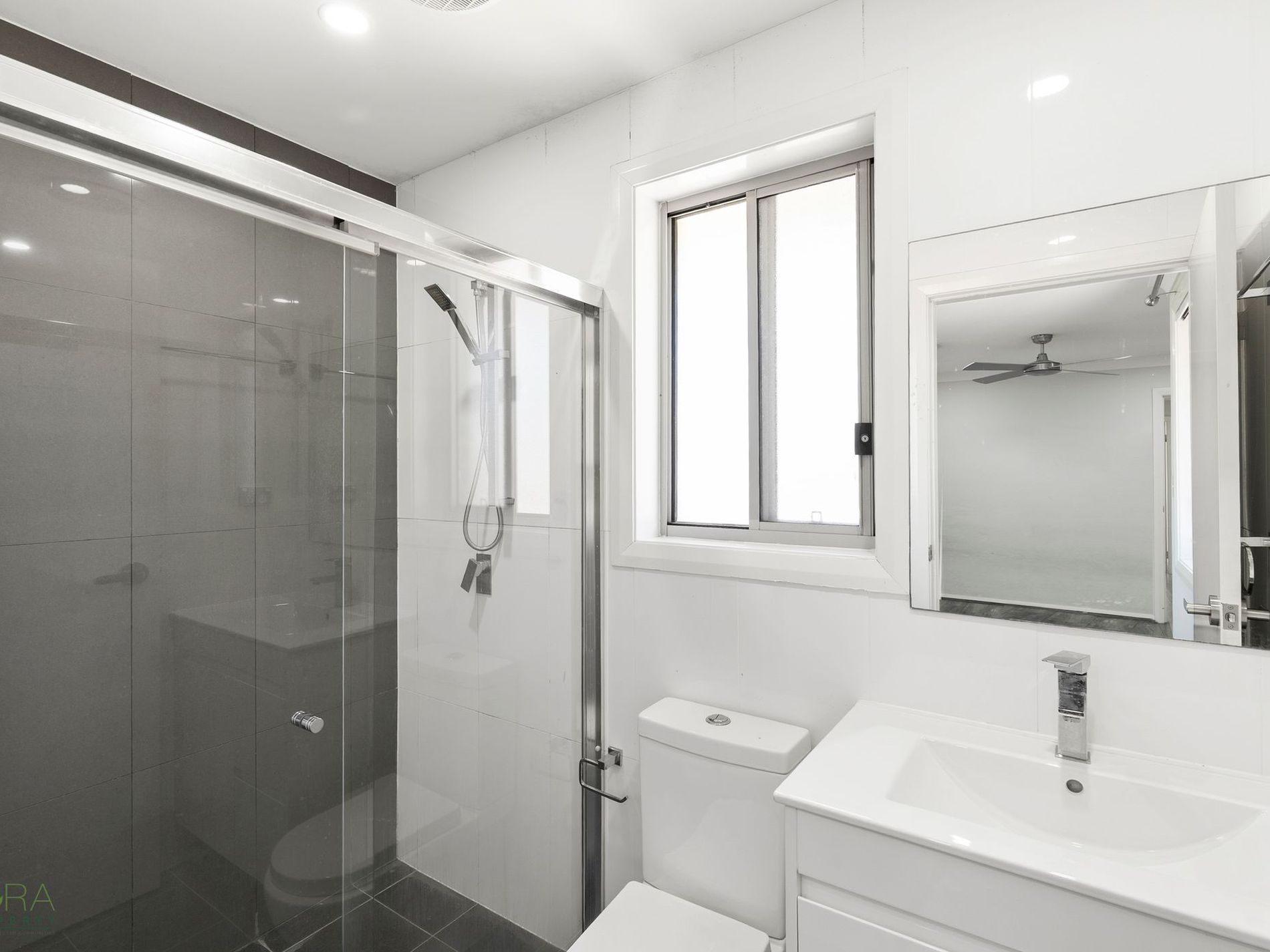 • Spacious main bathroom with mirrored vanity, toilet and shower.